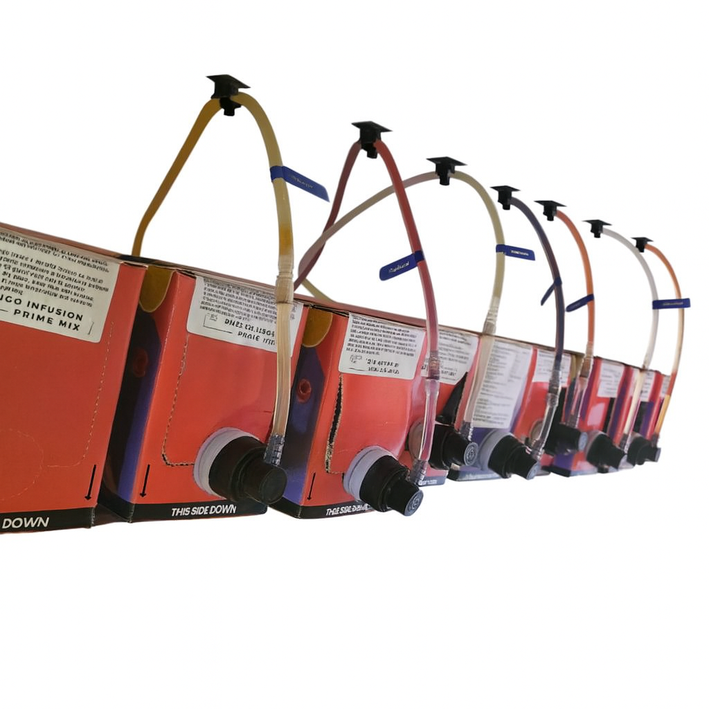 Los consumibles vienen en tetra packs de 3 litros, con una caducidad de hasta 10 meses. Cada pack rinde unas 60 bebidas. La carga se compone de 11 tetra packs de sabores sin alcohol y 4 destilados (vodka, ginebra, ron, whisky o tequila).